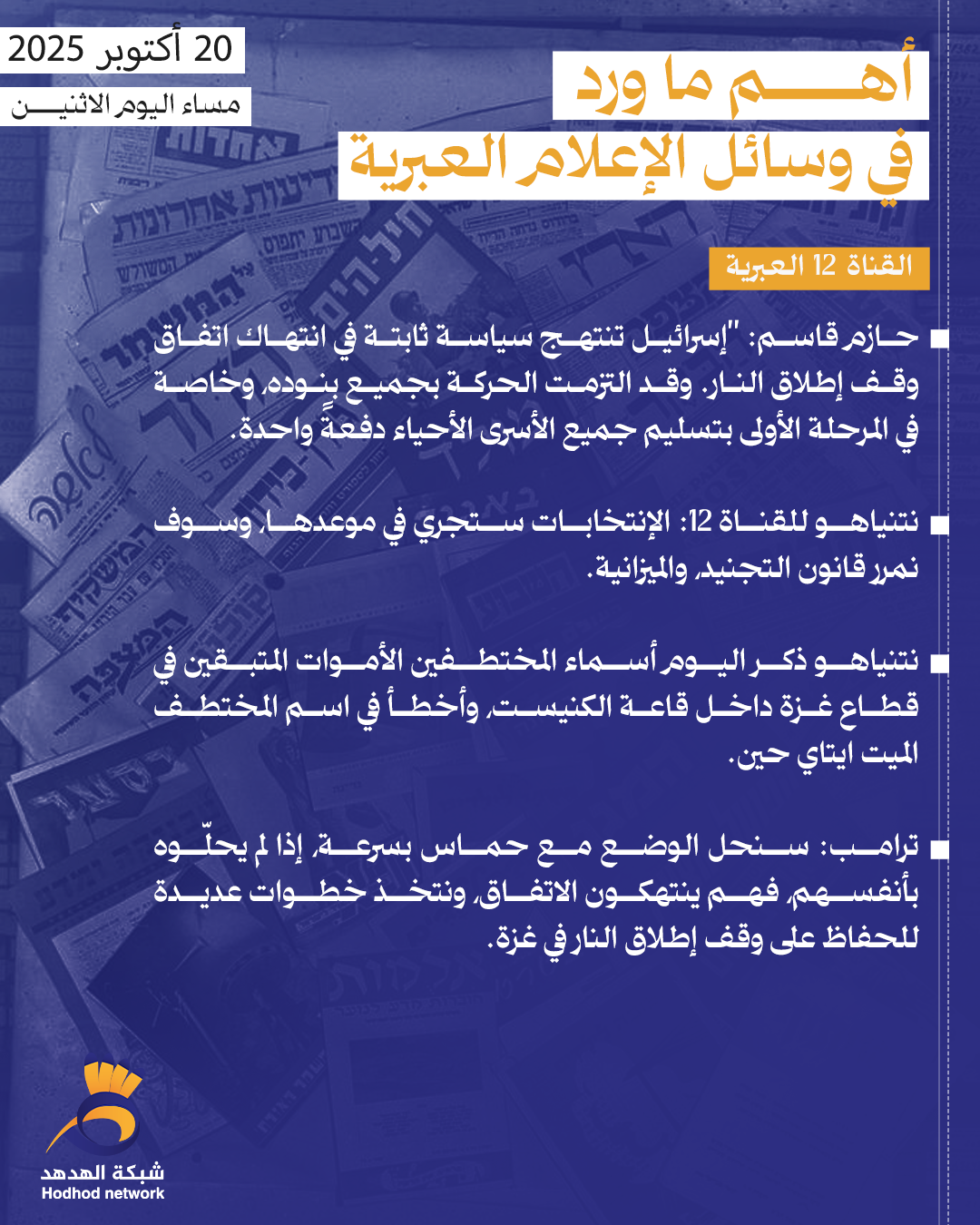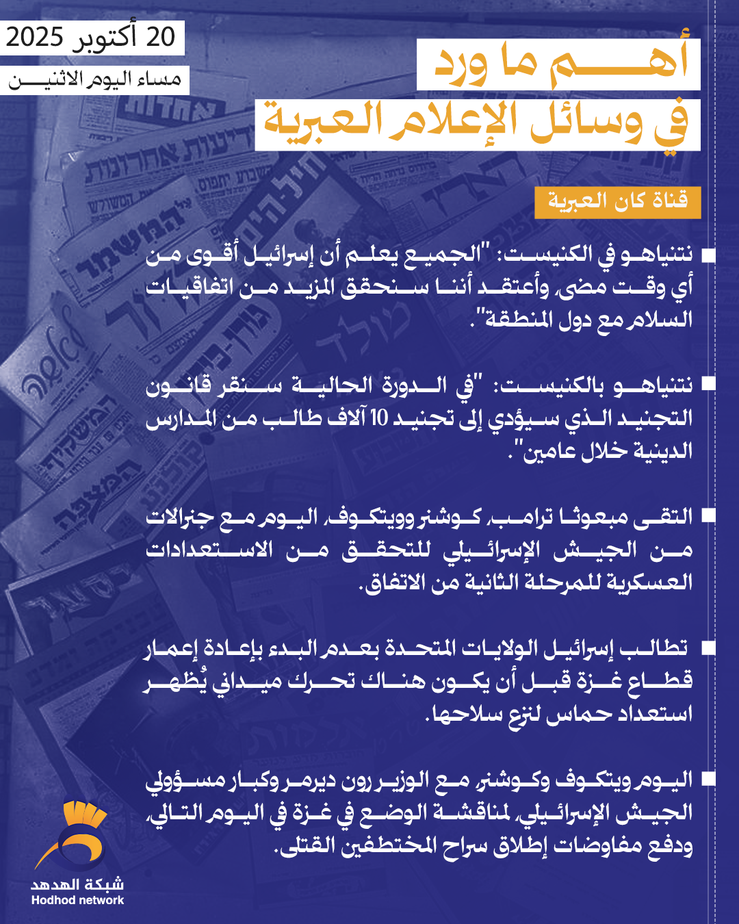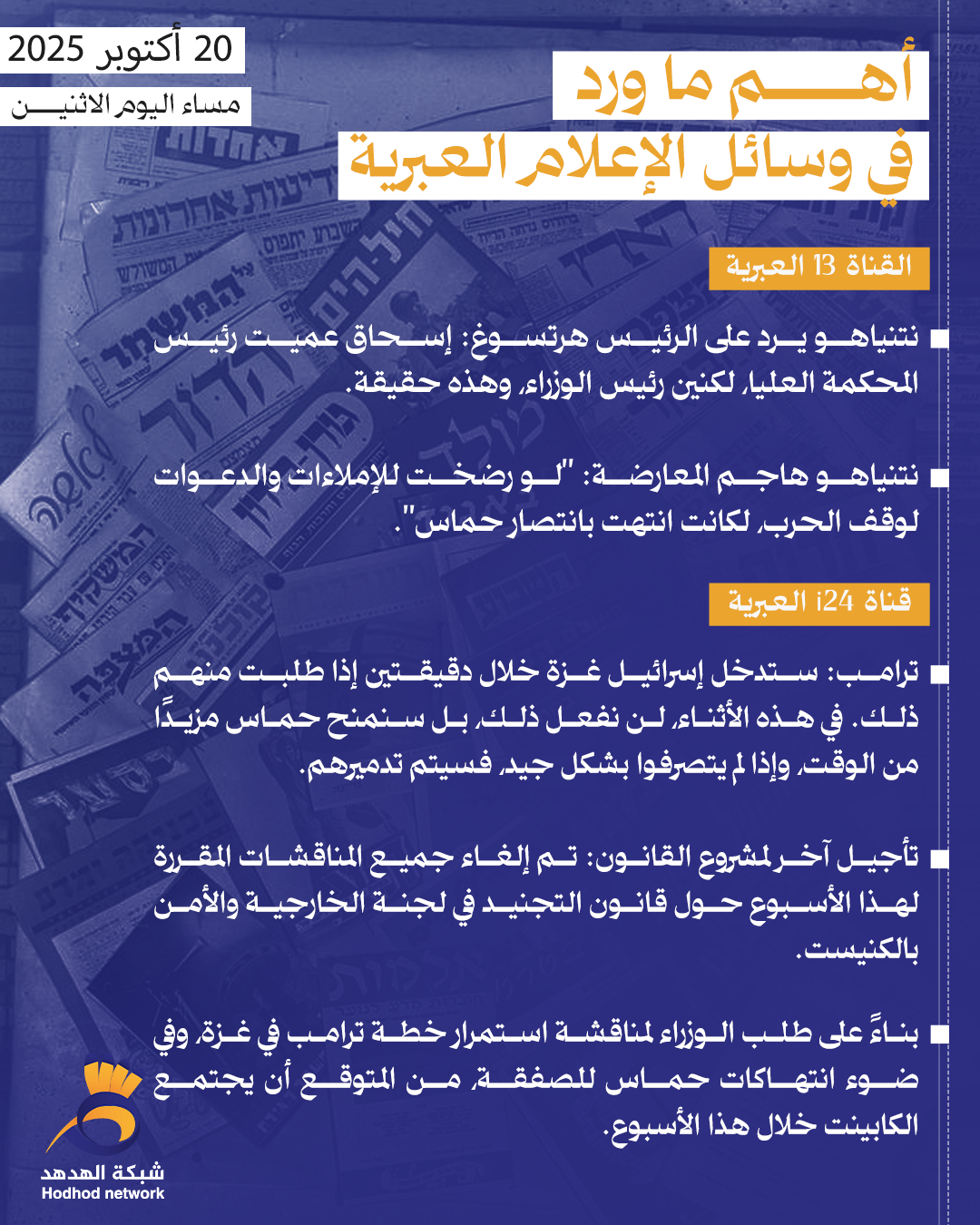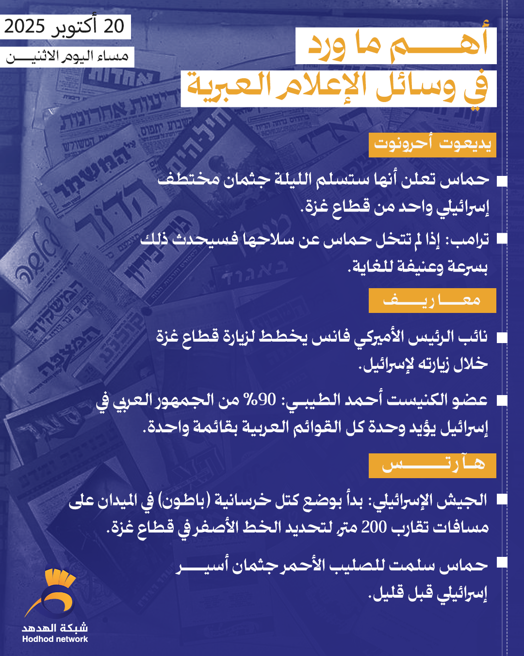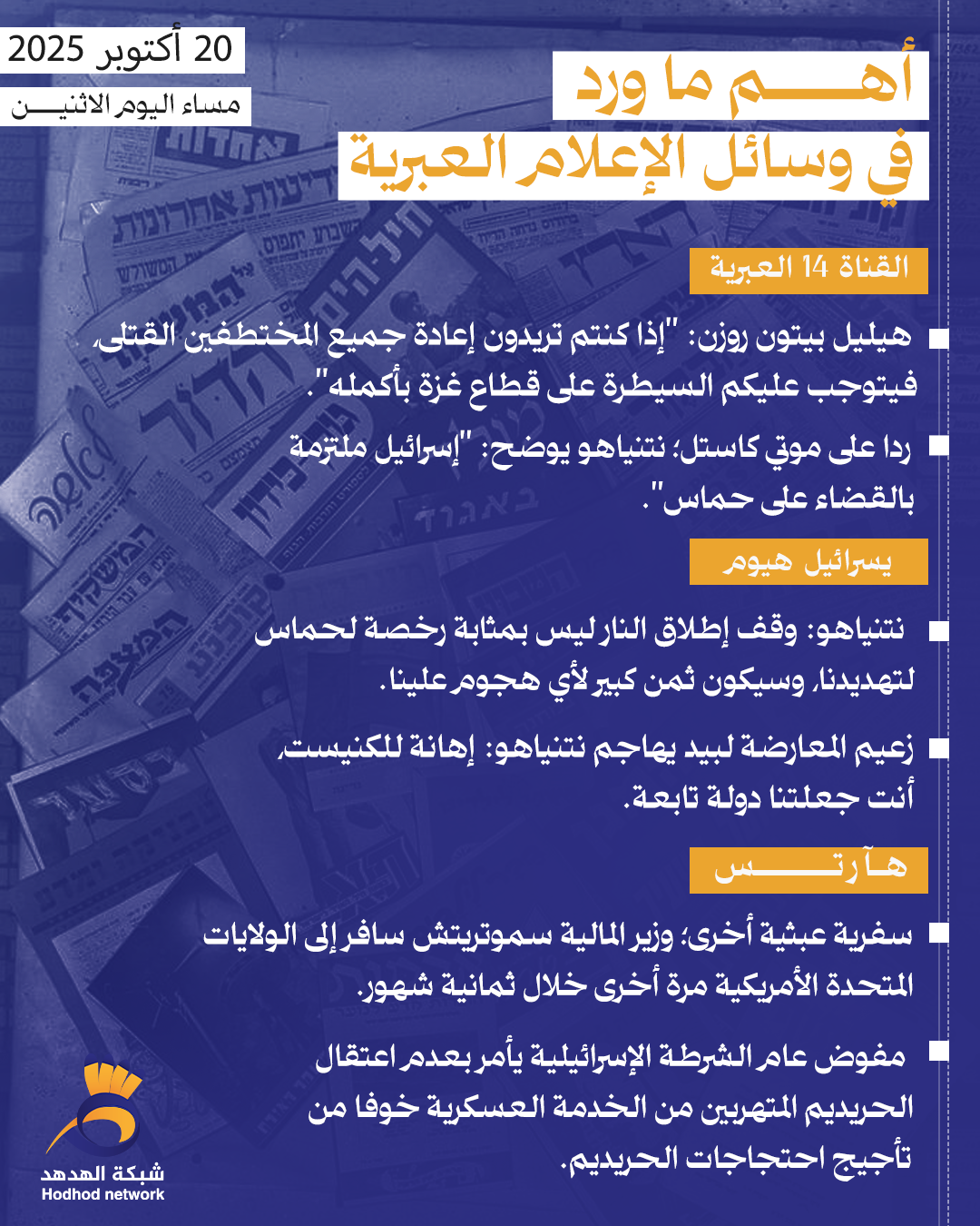 أبرز العناوين بوسائل الإعلام العبرية مساء اليوم الاثنين ترجمات 20 أكتوبر 2025 كلمات دلالية الإعلام العبري قراءات الصحف غزة العدو